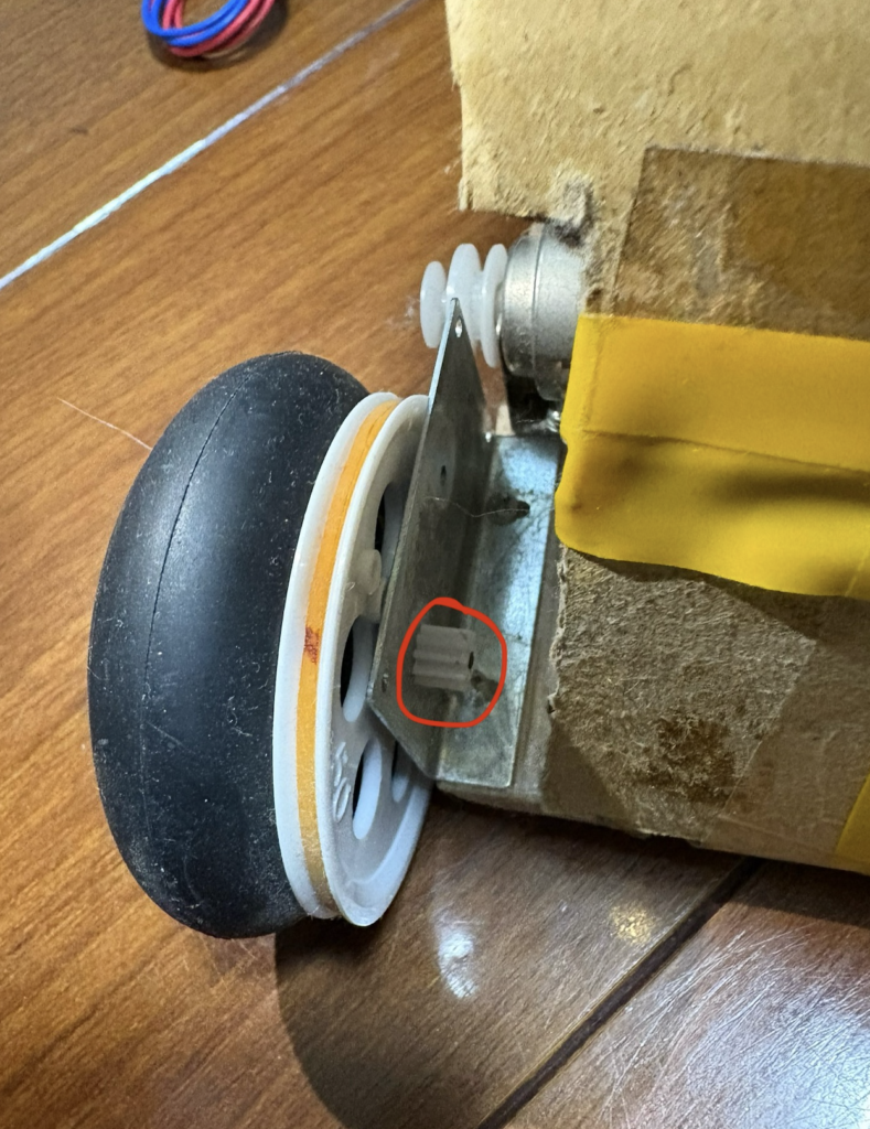 さて、先ほど何回も修復してると言いました。まず、駆動をタイヤに伝える機構が、最初はギアを噛ませて作っていました。しかし材料が材料なので、時間が経つと車両自体が歪んできます。ギアは位置が1mmでもズレると噛み合わなくなるので、すぐに車両は動かなくなってしまいました。そこで導入したのがプーリーです。プーリーのベルトとして輪ゴムを使っており、輪ゴムを使ったプーリー方式なら、位置が多少ずれても輪ゴムの伸縮性で駆動は伝わります。だから「ダンボールモノコック」な車両には最適なわけですね。