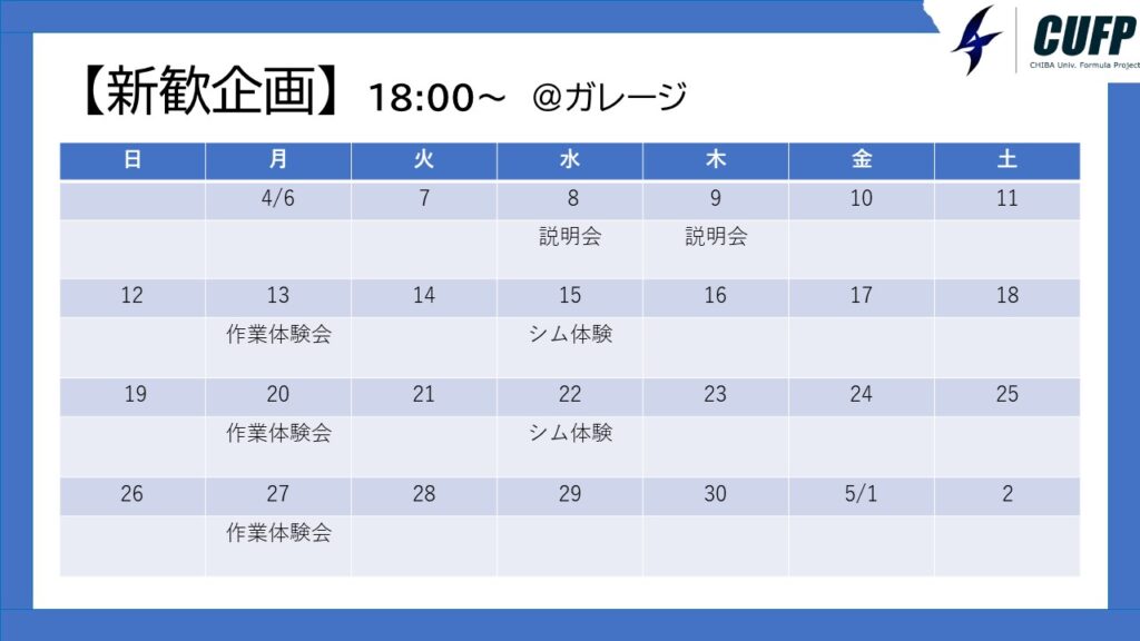 千葉大学フォーミュラプロジェクト(CUFP)は学生主体でチームの運営を行い、フォーミュラカーという商品を作る活動をしています。年に1回開催される「学生フォーミュラ日本大会」に出場することを通じてもの造りの重要性と楽しさを学ぶと共に、将来エンジニアやマネジメントに役に立つであろう事を仮想企業という形で学んでいます。
