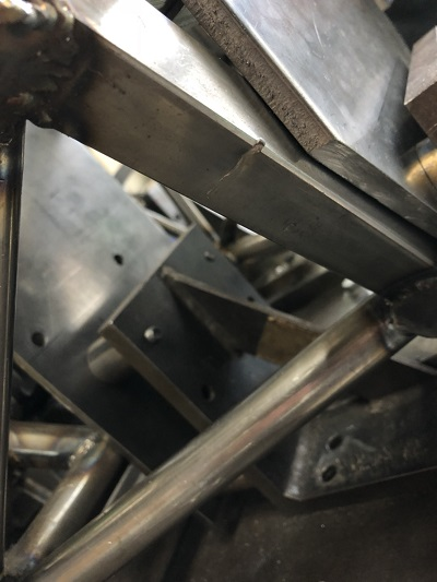 僕は、ある箇所の冶具を立てていたのですが、注意不足で本来の向きと逆さまに治具板をつけてしまい、さらに板がフレームのパイプに当たっていることに気が付かないまま、無理やり最後までボルトを締め付けてしまいました。その結果、リアバルクヘッドのパイプの1本を大きくえぐってしまいました。下の写真をご覧下さい。