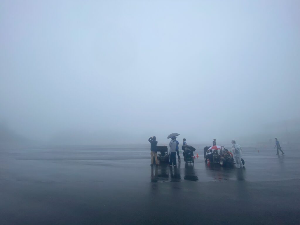 自分がポスト担当だった前半のオートクロスでは霧がかかったり晴れたりしながらの走行だったのですが、路面はところどころドライアップしつつある状況でした(13:30~14:30)。その時の走行は京工繊と工学院が交互に走っていましたが、京工繊の低速域での動きが気持ち悪いくらいにキビキビ動いて向きを変えられていてさすがだと感じていました。コース後半の左ー左(13,14コーナー?)では出口でほんのちょっぴりアンダー気味に見えたものの前がクッと入っていけてる印象で、強いなと感じました。また、意外だったのが工学院で、左ー左のコーナーではほとんどニュートラルで曲がれていて、クルマが決まっていそうな雰囲気でした。ウェットコンディションでは路面の状況が刻々と変化するので一概には比較できませんが、この2台が飛び抜けているように感じました。我々はというと現段階で勝っているのは加速とエンジン音ぐらいで、これからの1.5か月、少しでも近づけていけるよう自分にできることを精一杯やろうと思いました。