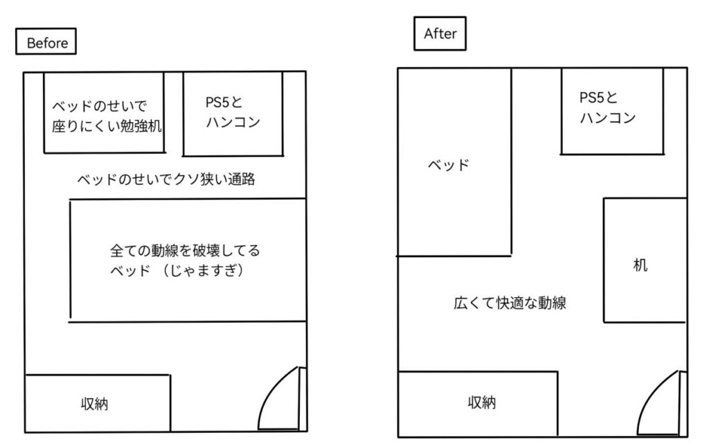 今まで部屋の間取りが完全に終わってたので(下記図参照)、より効率的に勉強するために模様替えしました。全部ひとりで動かしたので腰が痛いです。