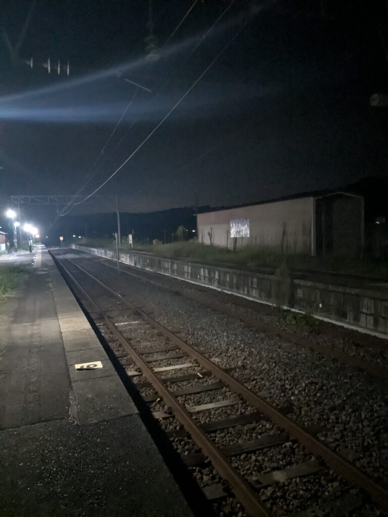 駅には何と人がいます。去年は私一人しかいなかったのに、今年は数人います。去年もいたら良かったのに。ホームに入ると、何と去年は閉鎖されていた跨線橋が綺麗さっぱり無くなっています。あれが線路渡りの判断を下した一因でもあったので、福原駅側も線路渡りをさせないため変化していたようです。もう線路渡りをする者は現れないでしょう。